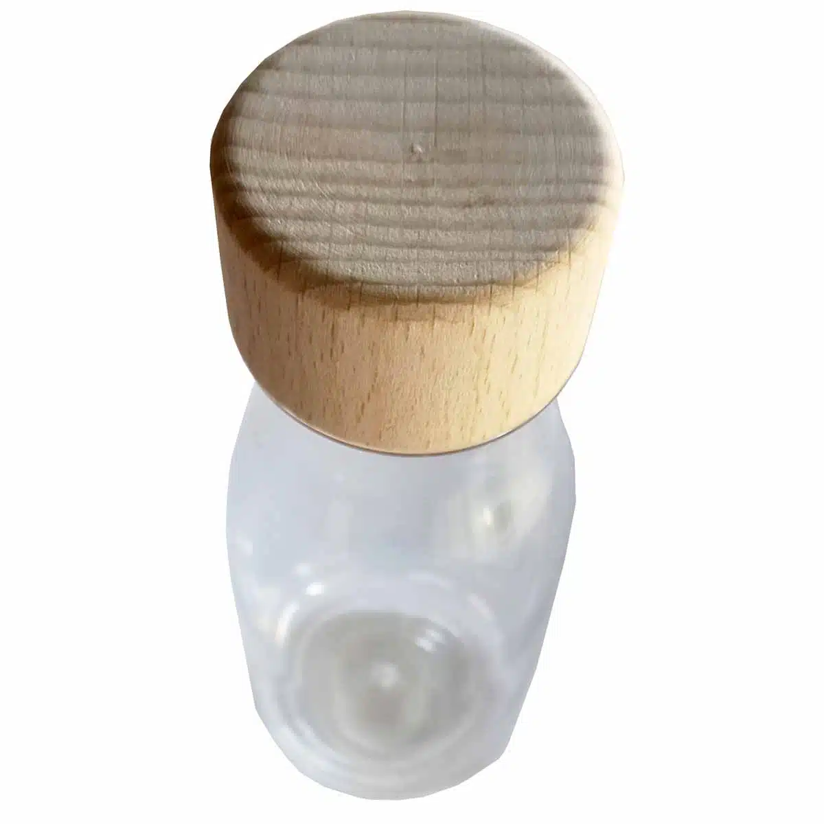 - Botella de plástico vacía y limpia con 2 tapas hermética. (la tapa de plástico y la tapa de bambú) 200ml