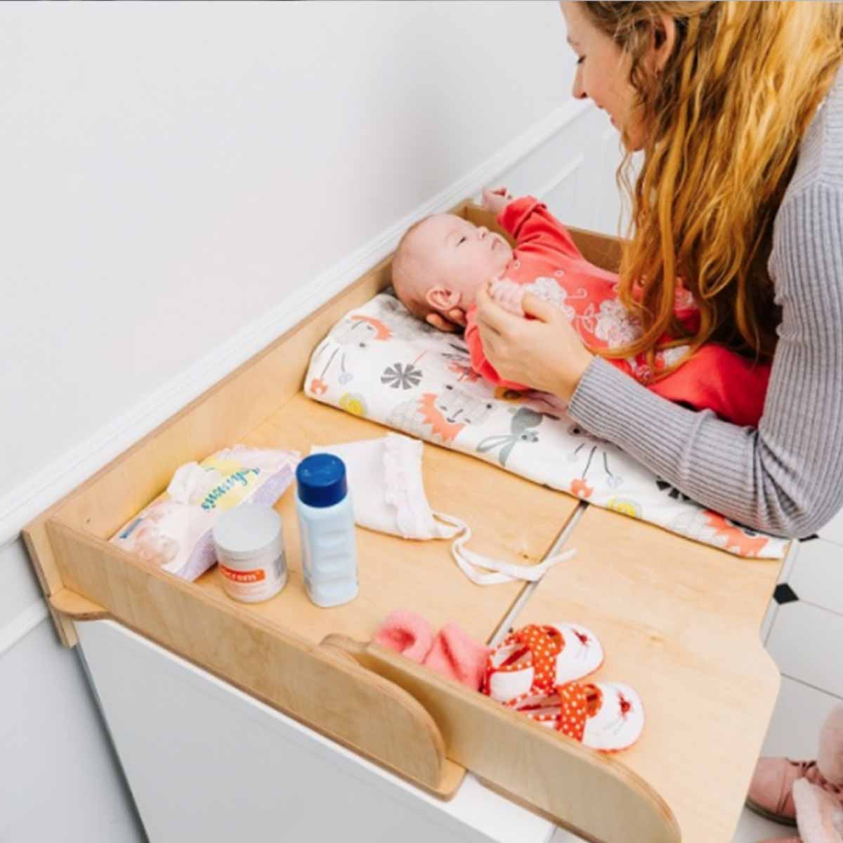 Lo suficientemente grande: la superficie del cambiador tiene aproximadamente 79 cm de ancho, por lo que habrá suficiente espacio para cambiar al bebé y para guardar pañales, cremas, toallas u otras cosas necesarias.