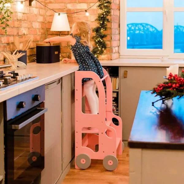 2. Estimular el aprendizaje: La torre de aprendizaje proporciona a los niños una plataforma segura y estable desde la cual pueden explorar y aprender sobre su entorno.2. Pueden observar y participar en actividades domésticas, lo que les permite adquirir conocimientos prácticos y desarrollar habilidades cognitivas.