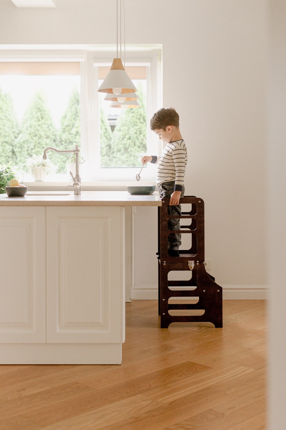 1. Fomenta la autonomía: La torre de aprendizaje permite que los niños participen activamente en las tareas cotidianas, como cocinar, lavarse las manos o cepillar los dientes. Al tener acceso a una plataforma elevada de manera segura, los niños pueden realizar estas actividades de forma independiente, lo que promueve su autonomía y autoconfianza.