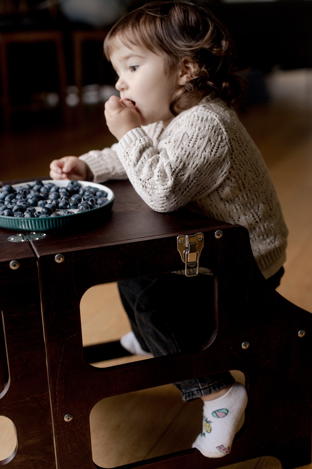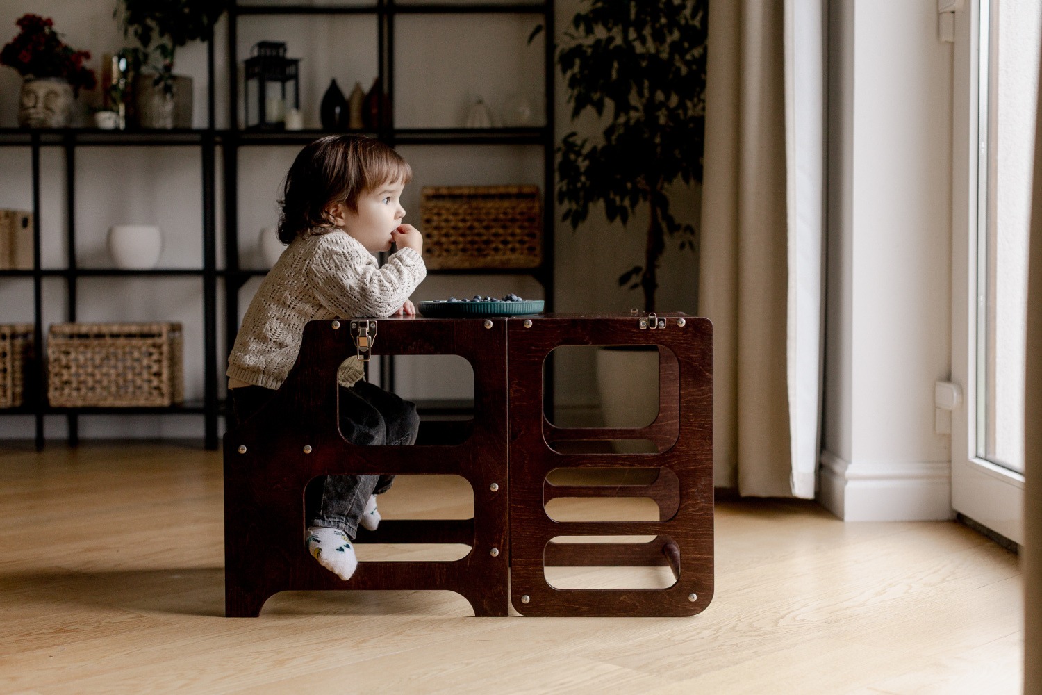Al convertirse en una silla y mesa,  brinda a los niños la posibilidad de tener su propio espacio de trabajo o juego. Pueden sentarse cómodamente en la silla y utilizar la mesa para actividades como dibujar, escribir, hacer manualidades o disfrutar de un refrigerio. Se adapta a las necesidades cambiantes de los niños a medida que crecen. Puede ser utilizada como una torre de aprendizaje para las etapas iniciales y luego transformarse en una silla y mesa.