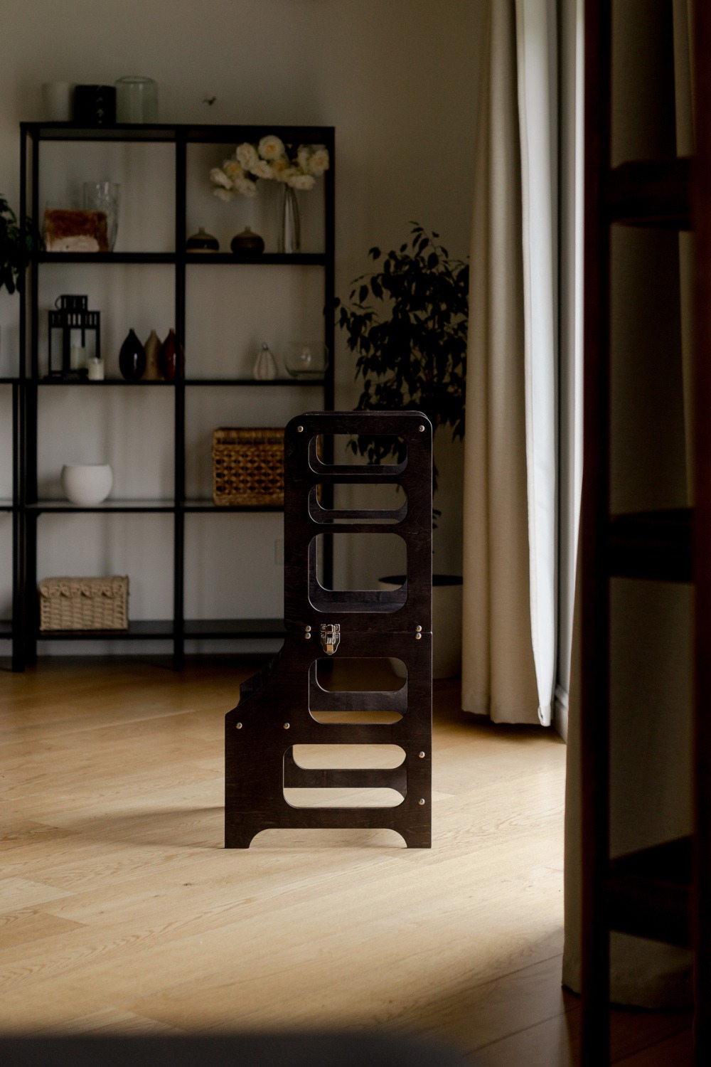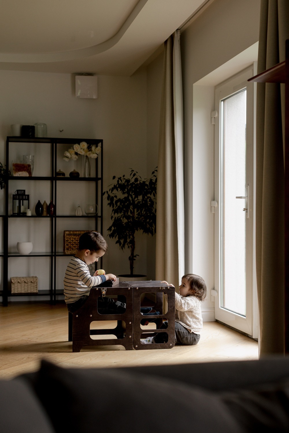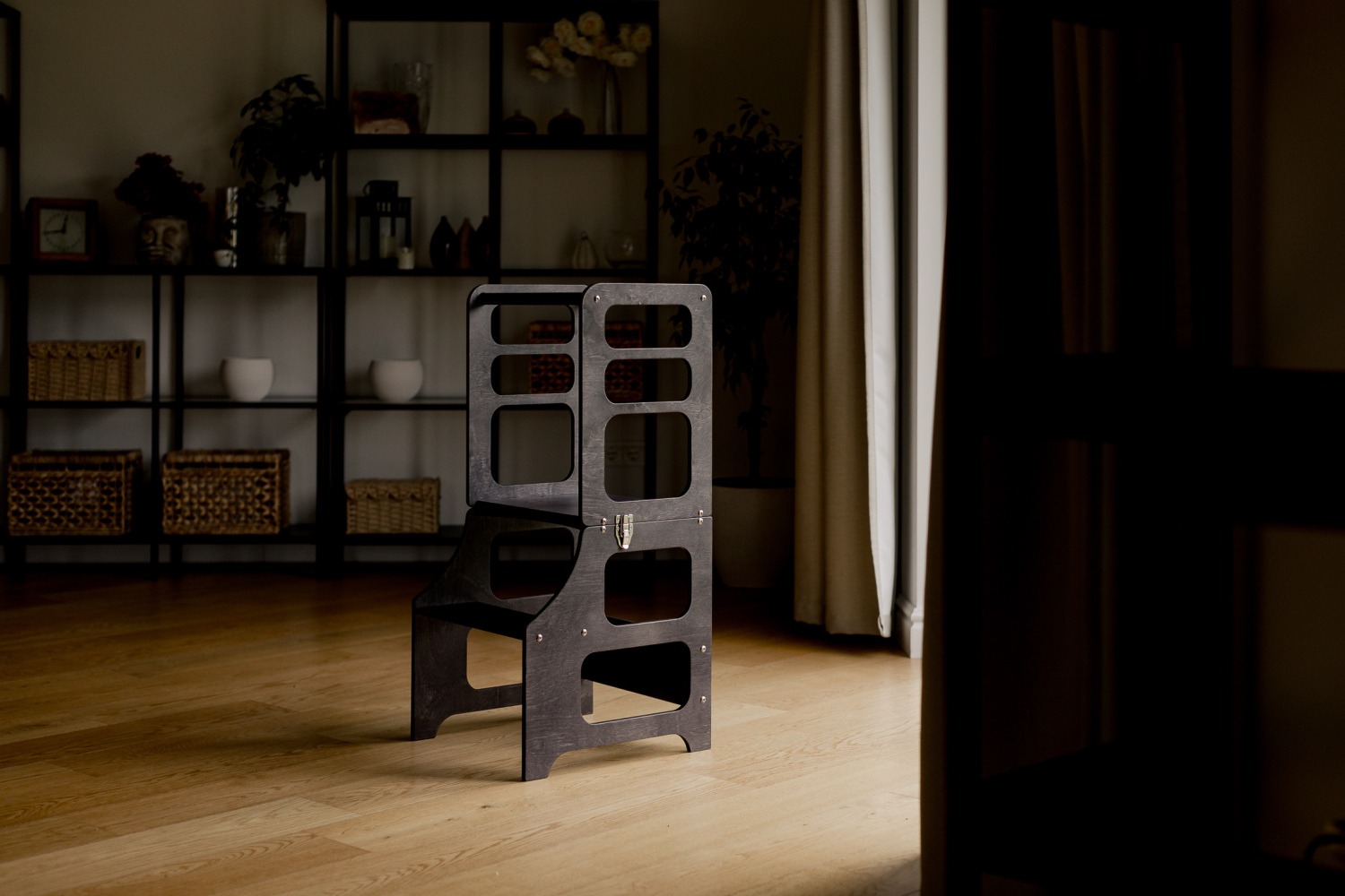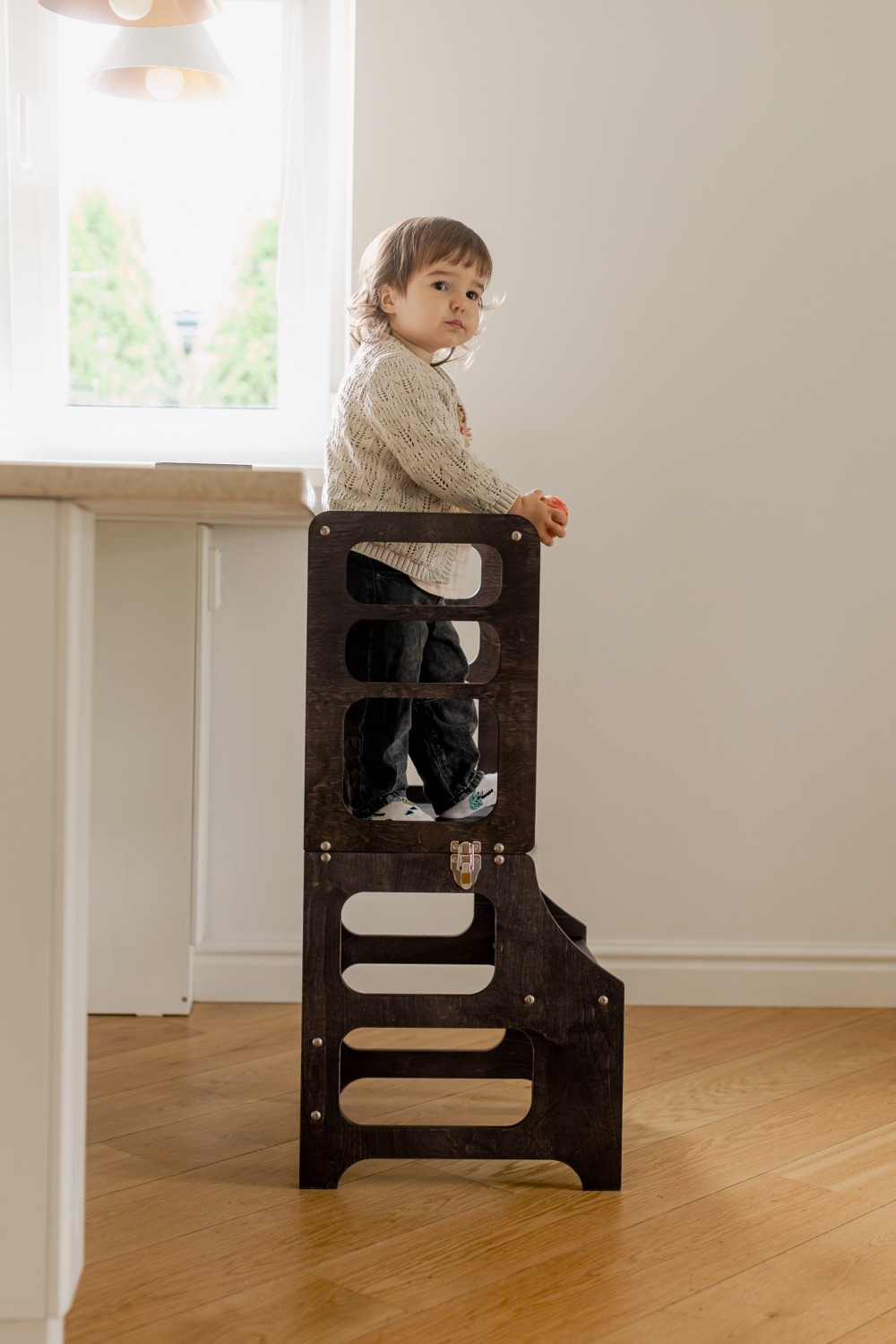 Al convertirse en una silla y mesa,  brinda a los niños la posibilidad de tener su propio espacio de trabajo o juego. Pueden sentarse cómodamente en la silla y utilizar la mesa para actividades como dibujar, escribir, hacer manualidades o disfrutar de un refrigerio. Se adapta a las necesidades cambiantes de los niños a medida que crecen. Puede ser utilizada como una torre de aprendizaje para las etapas iniciales y luego transformarse en una silla y mesa.
