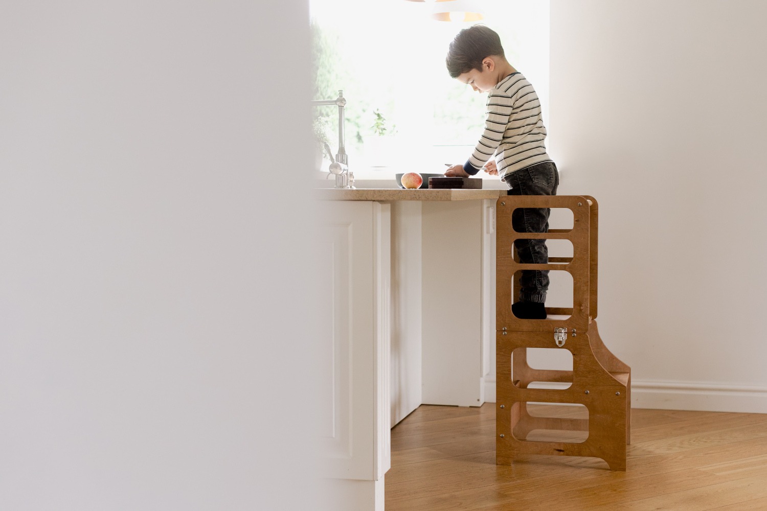 Fomenta la autonomía: La torre de aprendizaje permite que los niños participen activamente en las tareas cotidianas, como cocinar, lavarse las manos o cepillar los dientes. Al tener acceso a una plataforma elevada de manera segura, los niños pueden realizar estas actividades de forma independiente, lo que promueve su autonomía y autoconfianza.