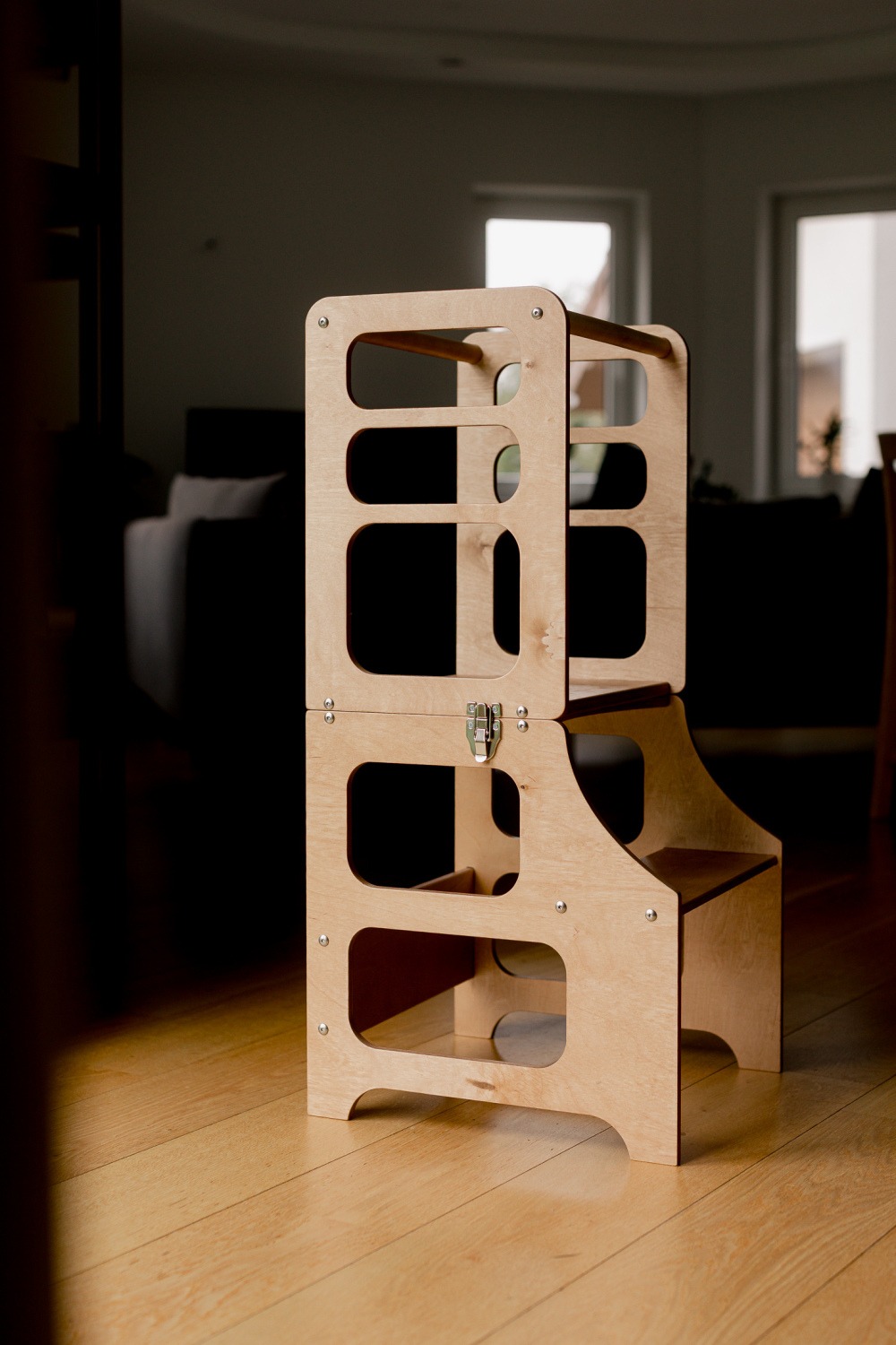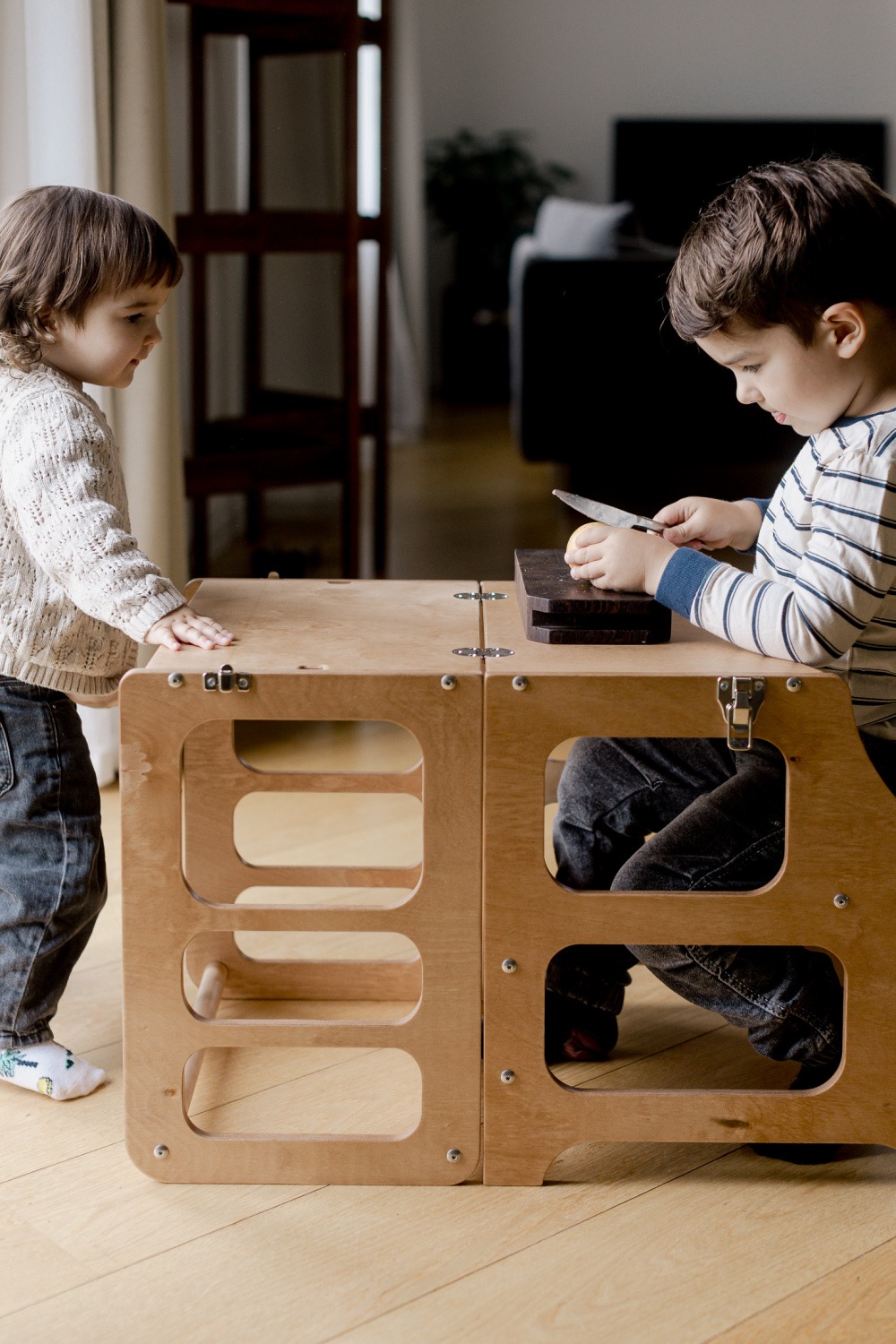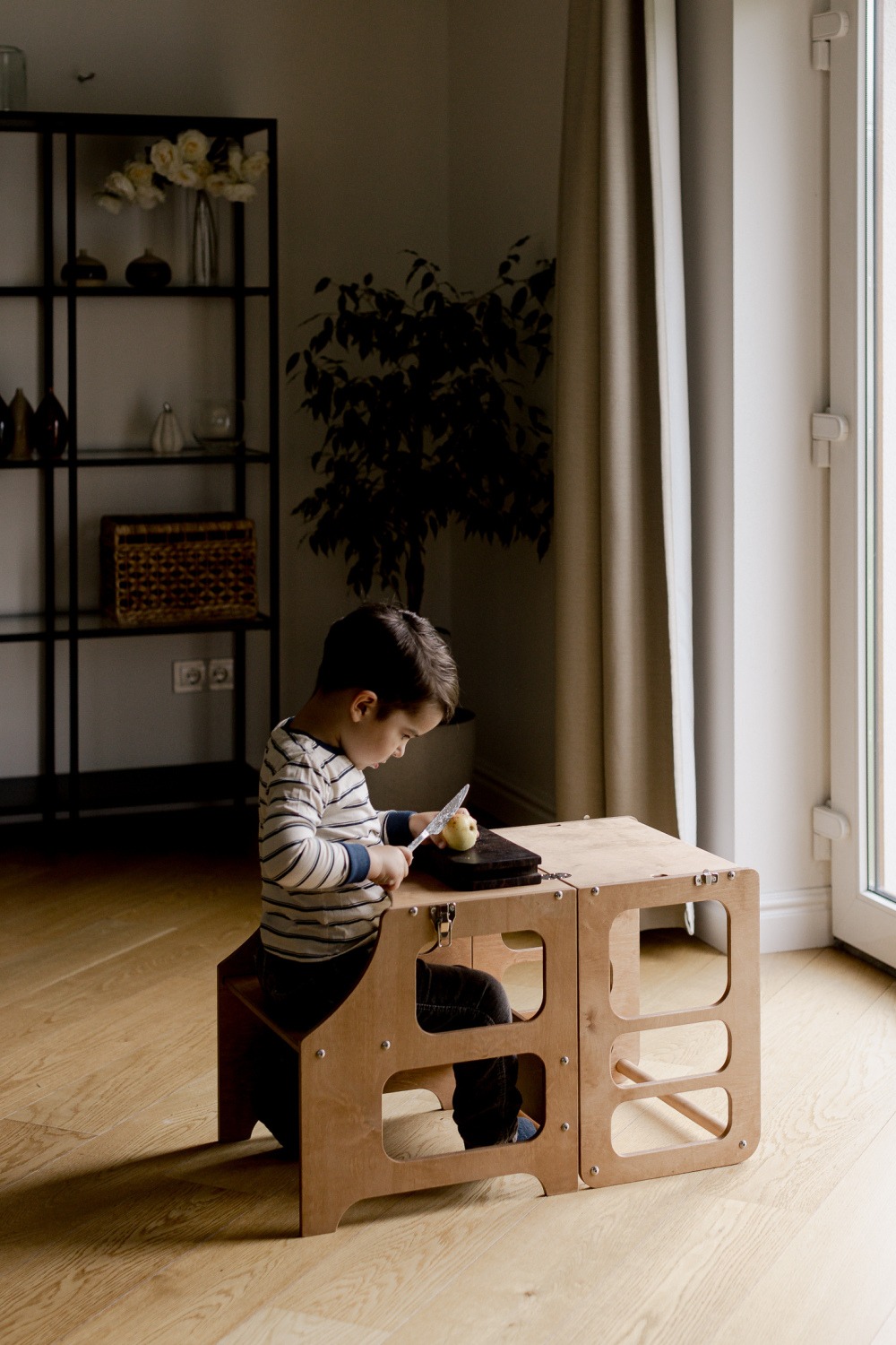 Al convertirse en una silla y mesa, brinda a los niños la posibilidad de tener su propio espacio de trabajo o juego. Pueden sentarse cómodamente en la silla y utilizar la mesa para actividades como dibujar, escribir, hacer manualidades o disfrutar de un refrigerio. Se adapta a las necesidades cambiantes de los niños a medida que crecen. Puede ser utilizada como una torre de aprendizaje para las etapas iniciales y luego transformarse en una silla y mesa.