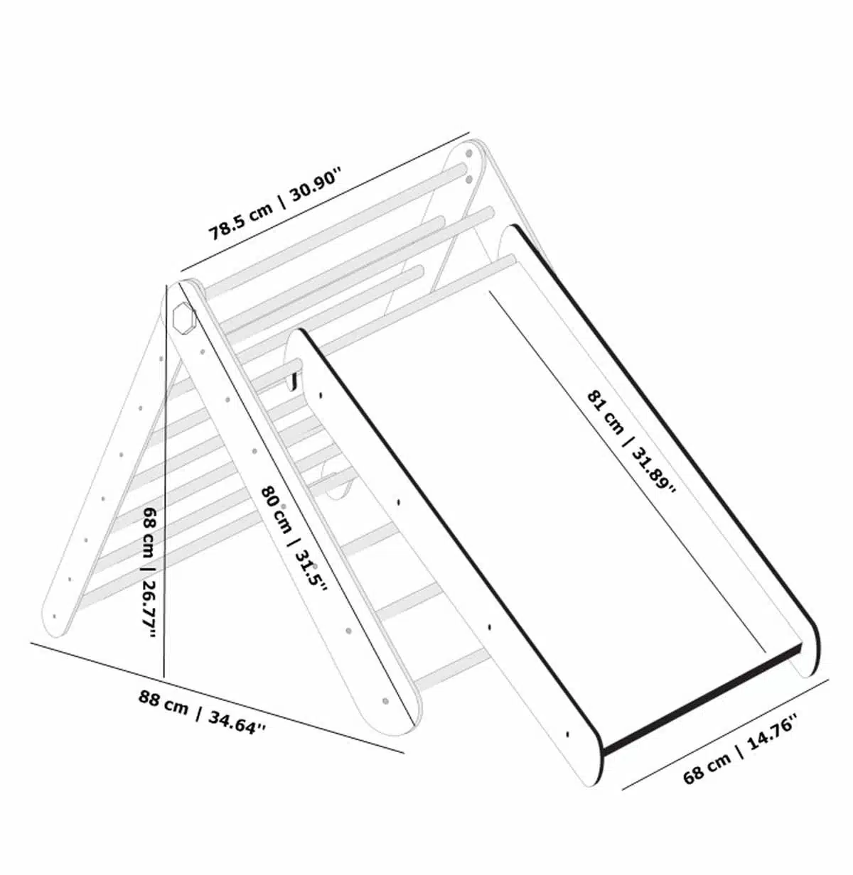 En resumen, el Triángulo Pikler con rampa es una estructura de madera que estimula el desarrollo físico y motor de los niños, promoviendo su autonomía, seguridad y autoestima. Proporciona un espacio de juego seguro y divertido donde los niños pueden explorar y desafiar sus habilidades física